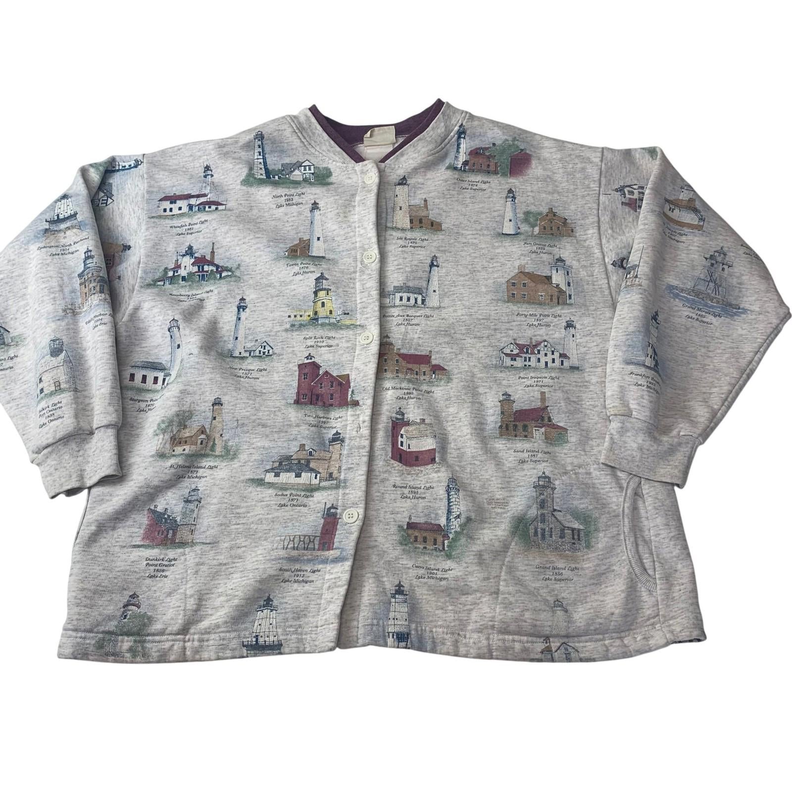 This vintage cardigan features a distinctive lighthouse print, making it a charming collectible piece. Made by Artisans Sunschein, it offers a button-up front and a comfortable fit, ensuring both style and ease of wear. The light grey fabric complements the intricate lighthouse graphics, giving it a unique appeal.